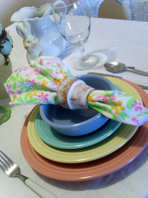 I've also recently started collecting Fiestaware dishes, so this is a fun way to show them off! Finding myself in need of new dishware, I suddenly felt very drawn to Fiesta...addicted is more like it! I love all the different colors, and the artist in me loves playing with color combinations. This setting features the colors rose, (retired) yellow, seamist green and periwinkle blue. I've had the cute, little clay pot napkin rings for years and the white ironstone pitcher is a recent Goodwill find.